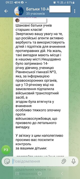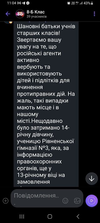 У батьківських вайбер-чатах шкіл Рівного поширюють попередження про вербування підлітків російськими агентами. За інформацією правоохоронців, у місті вже зафіксували подібний випадок — затримали 14-річну ученицю, яку втягнули у протиправні дії.