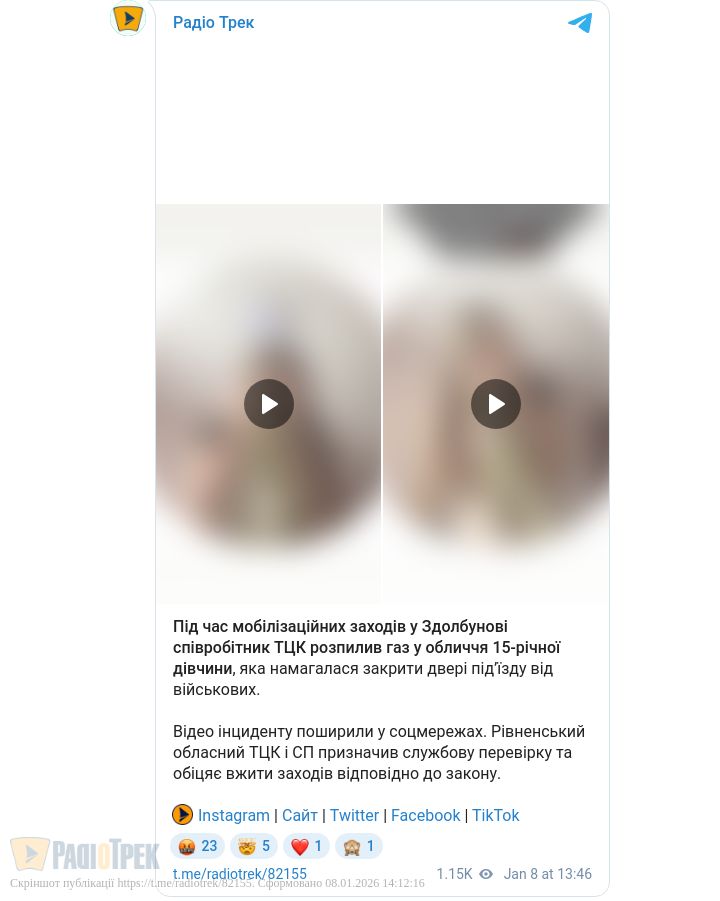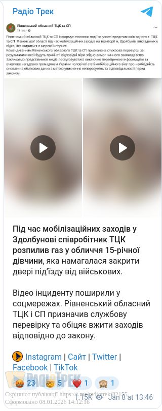 Під час мобілізаційних заходів у Здолбунові співробітник ТЦК розпилив газ у обличчя 15-річної дівчини, яка намагалася закрити двері під’їзду від військових.