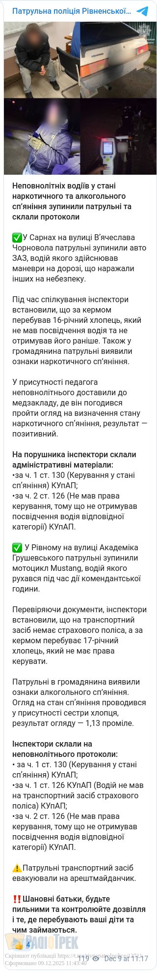 Двох нетверезих неповнолітніх водіїв виявили на Рівненщині. У Сарнах патрульні зупинили легковик ЗАЗ. Ним керував 16-річний хлопець, у якого були ознаки наркотичного сп’яніння.