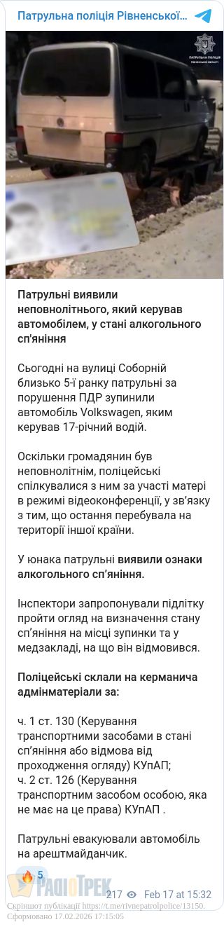 У 17-річного кермувальника помітили ознаки алкогольного сп’яніння, втім проходити перевірку він відмовився.