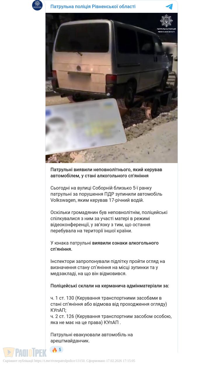 У 17-річного кермувальника помітили ознаки алкогольного сп’яніння, втім проходити перевірку він відмовився.