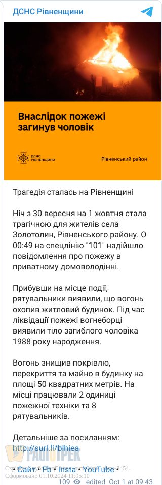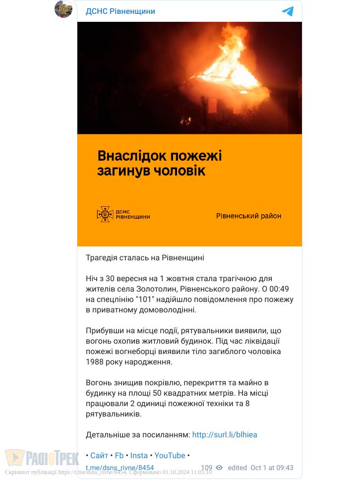 Під час ліквідації пожежі на Рівненщині рятувальники виявили тіло 36-річного чоловіка. Загоряння у житловому будинку сталося у селі Золотолин, що неподалік Костополя. Коли вогнеборці прибули на місце події, вогонь вже повністю охопив оселю.