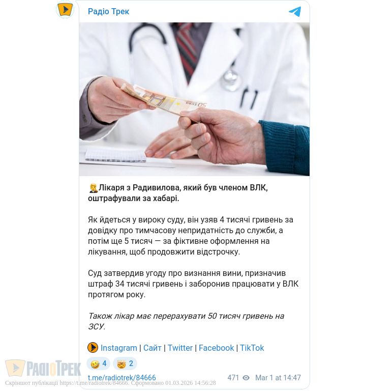 Лікаря з Радивилова, який був членом ВЛК, оштрафували за хабарі.