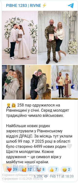 Упродовж січня на Рівненщині офіційно зареєстрували шлюб 258 пар.