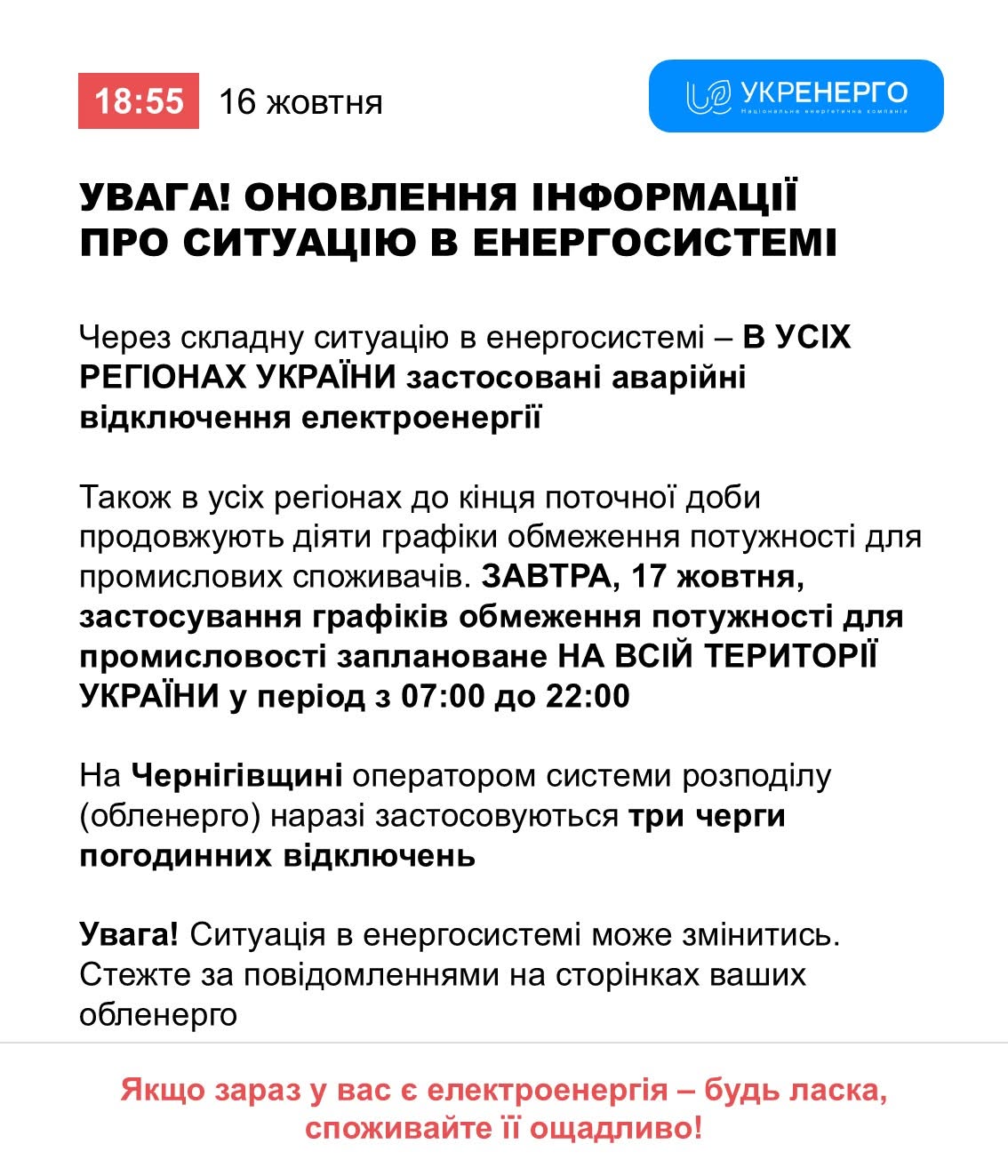 – Причина запровадження обмежень – гострий дефіцит електричної енергії внаслідок ураження генеруючої потужності з боку країни агресора. Обмеження будуть зняті після отримання відповідної команди з боку НЕК «Укренерго», – повідомляє Рівнеобленерго.