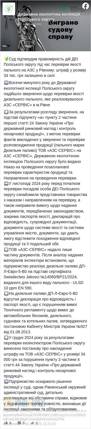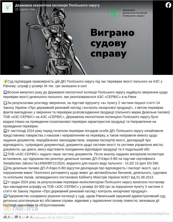 У Рівному автозаправку оштрафували на 34 тисячі гривень за порушення вимог до якості пального, пише Держекоінспекція поліського округу
