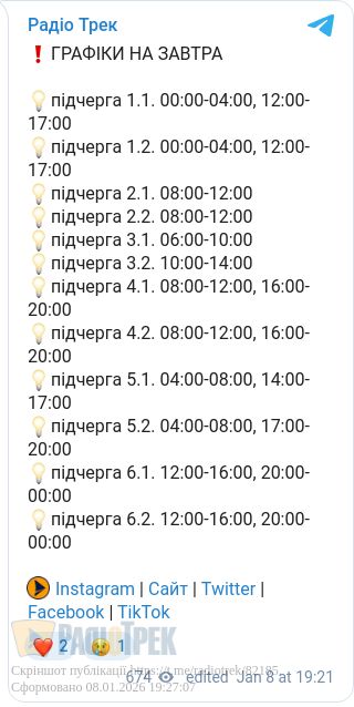 Графіки відключень електроенергії діятимуть завтра на Рівненщині. Світло вимикатимуть на три-чотири години для споживачів усіх черг, подекуди двічі.