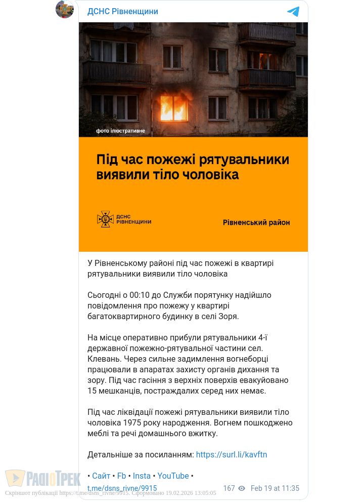 15 людей евакуювали з багатоповерхівки у Зорі, що неподалік Рівного. Там сьогодні близько опівночі сталася пожежа.