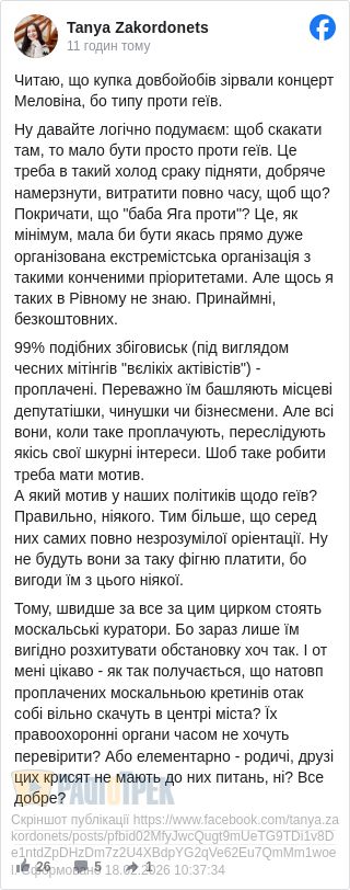 Тепер у соцмережах можна прочитати, що «Рівне вкрило себе довічною ганьбою» через зрив концерту ЛГБТ-артиста, а дехто навіть переконаний, що й сам «протест» був організований із Москви – спецслужбами Путіна.