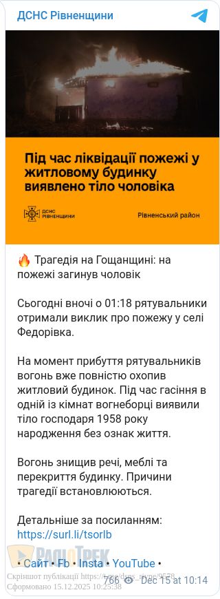 Чоловік загинув на пожежі на Рівненщині. Трагедія сталася сьогодні вночі о 01:18 на Гощанщині.