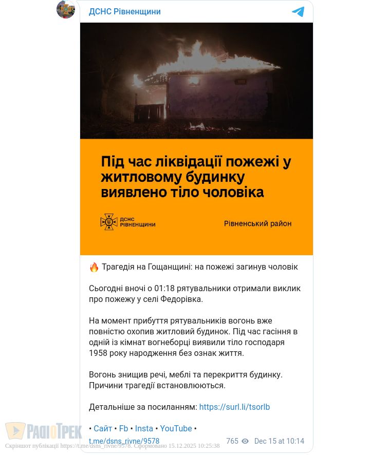 Чоловік загинув на пожежі на Рівненщині. Трагедія сталася сьогодні вночі о 01:18 на Гощанщині.