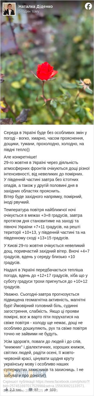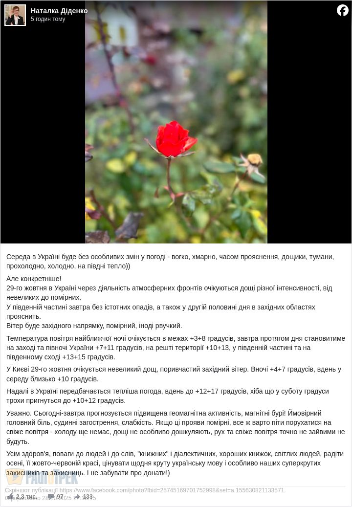 Синоптик Наталка Діденко також прогнозує потепління. Вдень, за її словами, може бути до +12…+17 градусів. Лише у суботу 1 листопада похолоднішає до +10…+12 градусів.