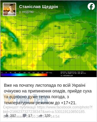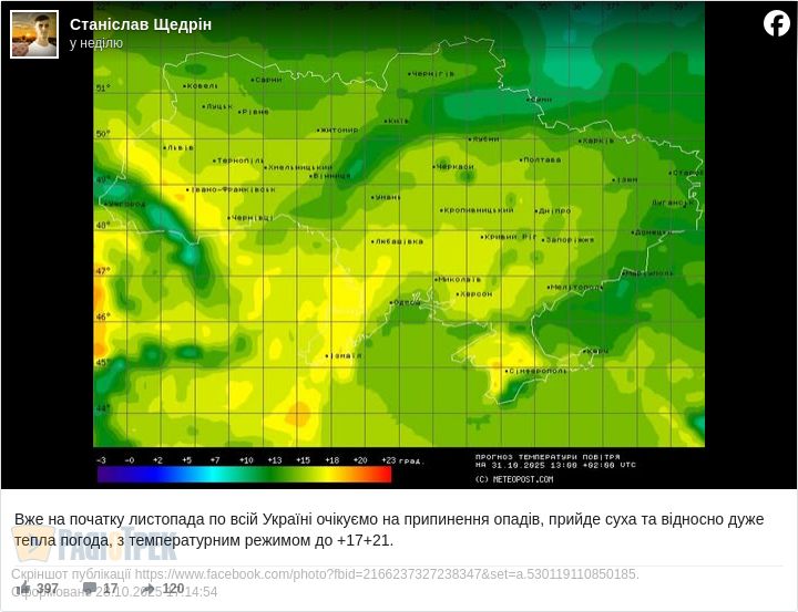 На початку листопада по всій країні очікується припинення опадів, а стовпчики термометрів підіймуться до +17…+21 градуса, повідомив народний синоптик Станіслав Щедрін.