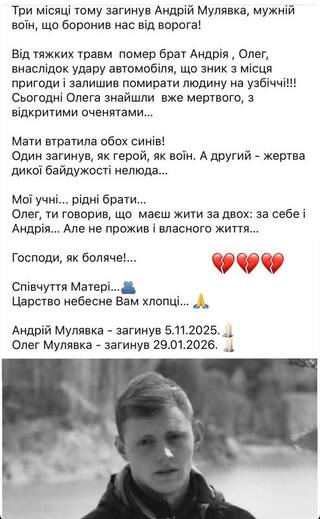 Трагедія стала особливо болючою для родини, адже три місяці тому на війні загинув його рідний брат — Андрій Мулявка. Він служив у лавах Сил оборони з початку повномасштабного вторгнення та загинув 5 листопада 2025 року на Донеччині. Попрощалися з ним 14 листопада. Дітей у нього не було.