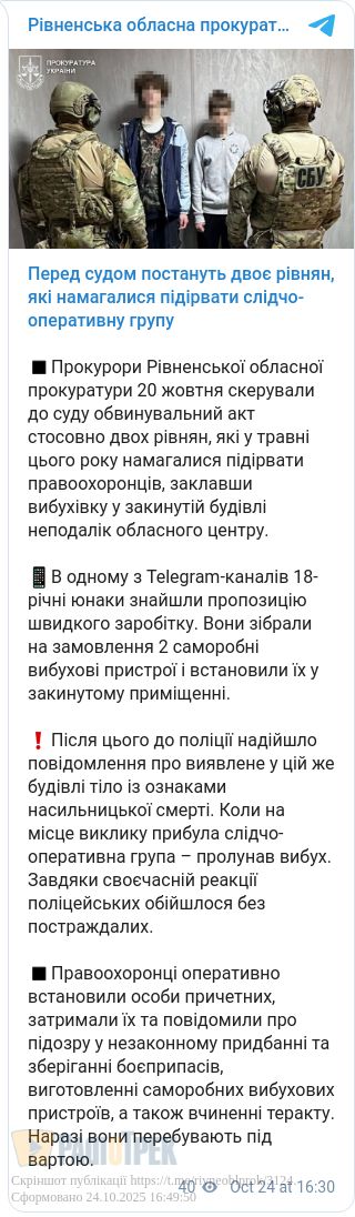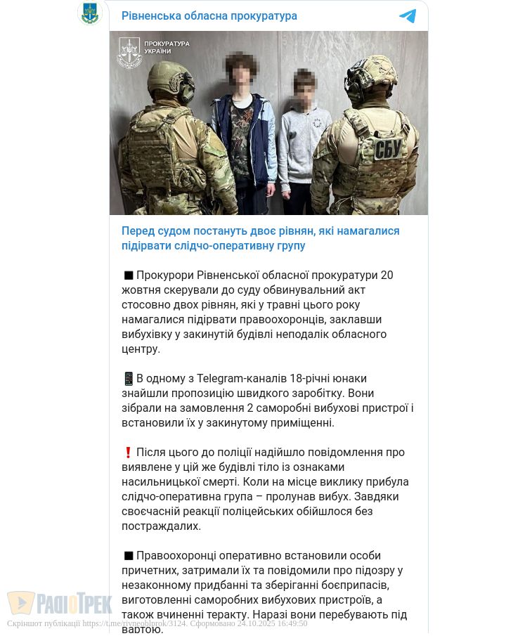 Юнаки знайшли в Telegram пропозицію заробітку, зібрали два саморобні вибухові пристрої та заклали їх у закинутій будівлі поблизу Рівного.
