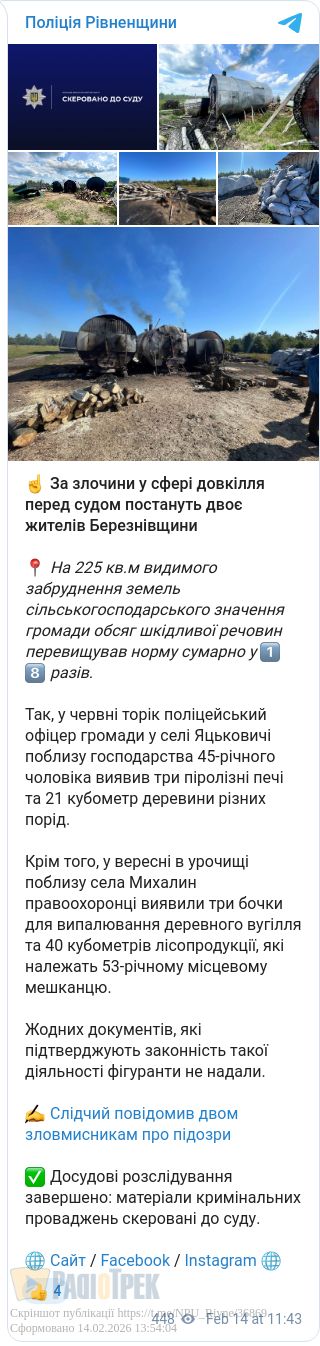 Двоє жителів Березнівщини постануть перед судом за злочини у сфері довкілля. Торік у червні в селі Яцьковичі поліцейський офіцер громади виявив біля господарства 45-річного чоловіка три піролізні печі та 21 кубометр деревини.