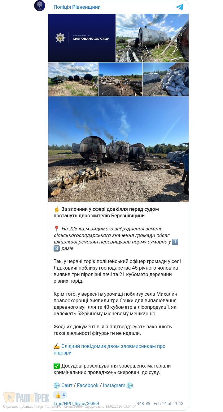 Двоє жителів Березнівщини постануть перед судом за злочини у сфері довкілля. Торік у червні в селі Яцьковичі поліцейський офіцер громади виявив біля господарства 45-річного чоловіка три піролізні печі та 21 кубометр деревини.