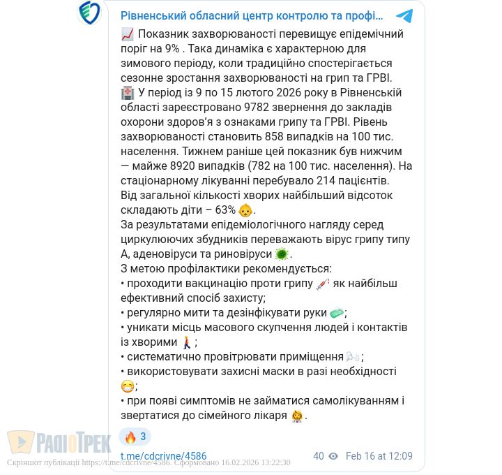 Епідпоріг на Рівненщині перевищений, а кількість хворих на грип та ГРВІ зростає. За минулий тиждень до медиків в області звернулися майже 10 тисяч осіб, це на тисячу більше, ніж тижнем раніше.