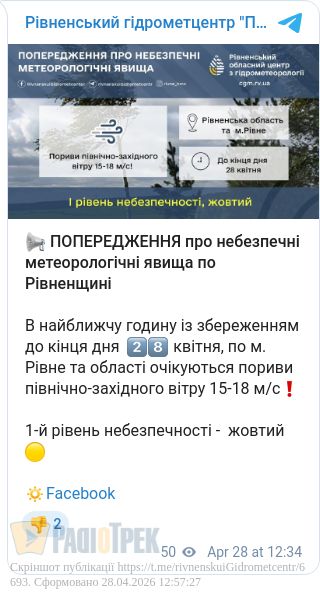 В найближчу годину із збереженням до кінця дня у Рівному та області очікуються пориви північно-західного вітру до 15-18 м/с.