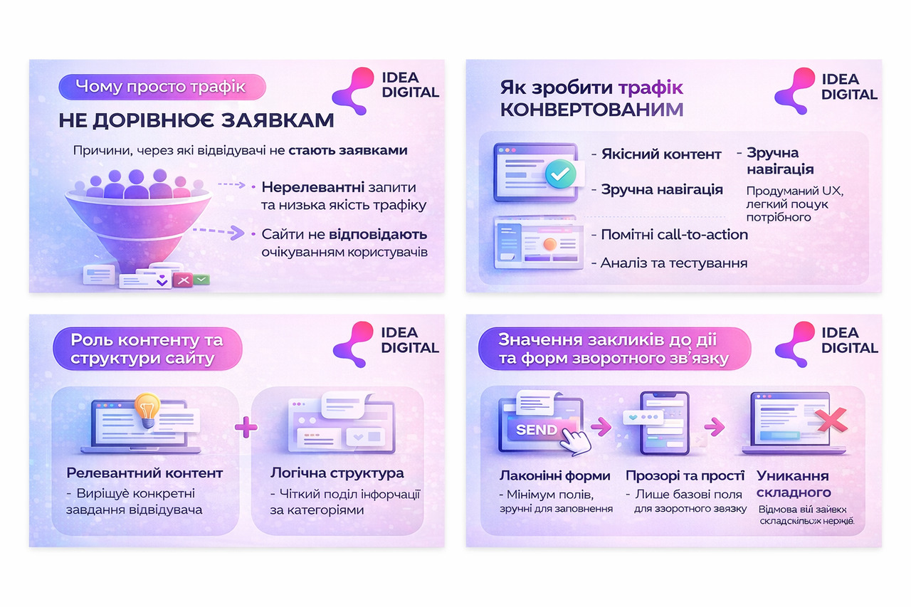 Зростання відвідувачів на сайті часто сприймається як вже досягнутий успіх просування, однак високий трафік не завжди призводить до отримання заявок. Проблема в тому, що без правильної взаємодії з відвідувачами їхній інтерес не перетворюється на конкретні дії. Щоб трафік почав приносити клієнтів, недостатньо лише залучити користувачів — потрібно забезпечити зручність, зрозумілість та мотивацію до зворотного зв’язку.