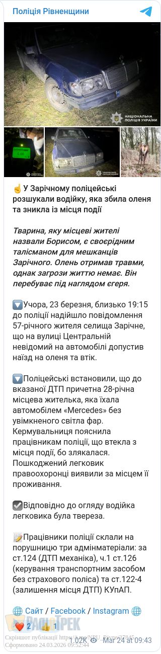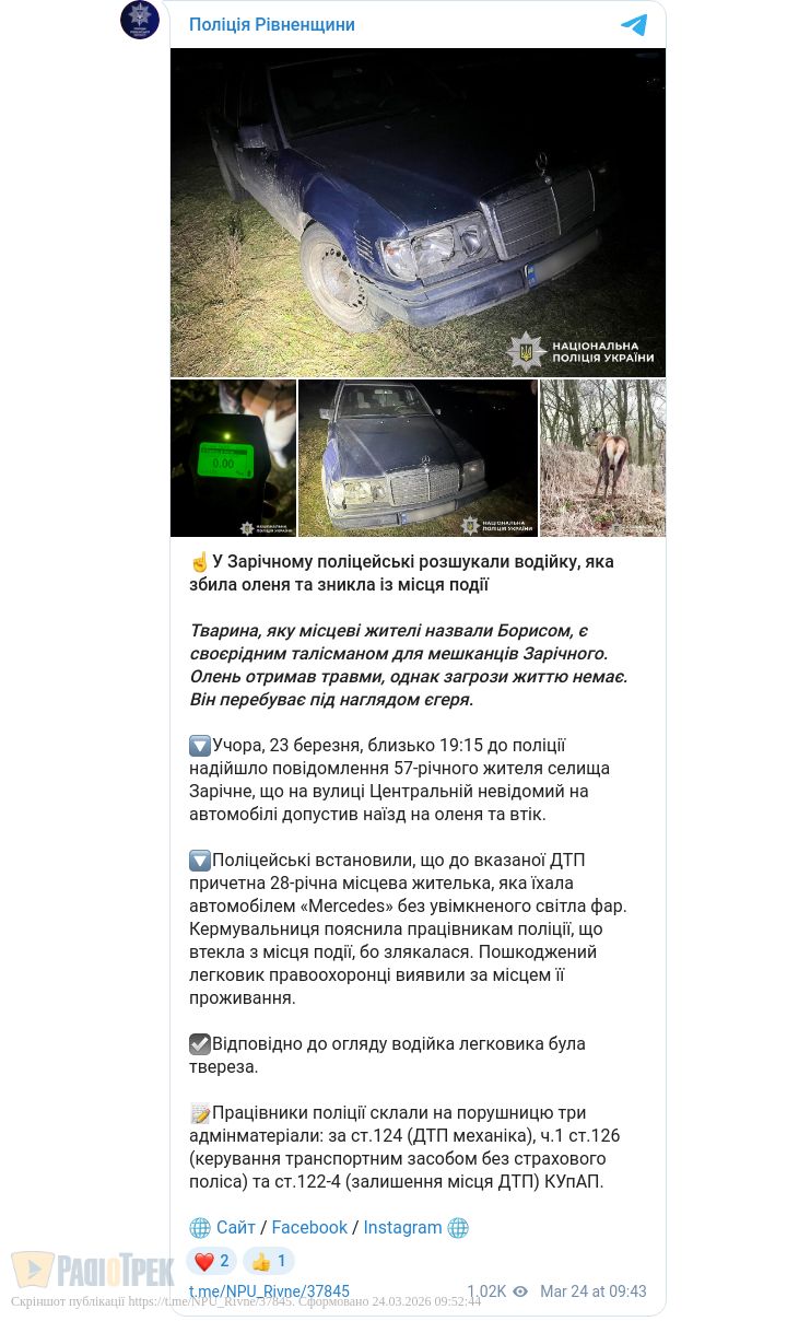 Перлину Рівненщини — оленя Бориса — збив автомобіль.