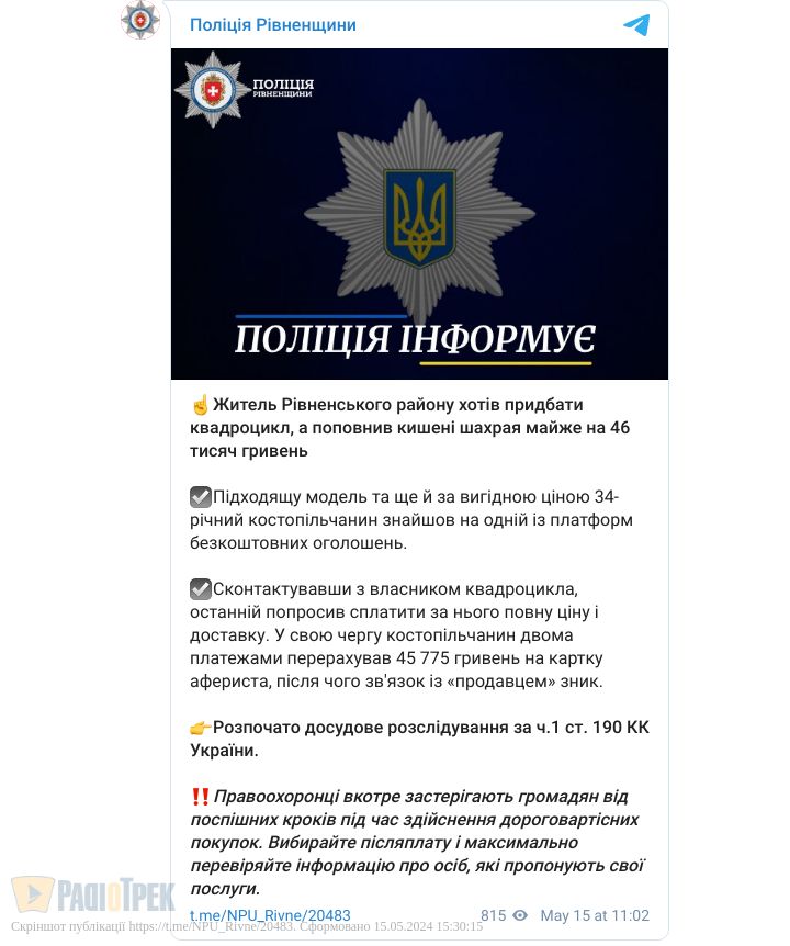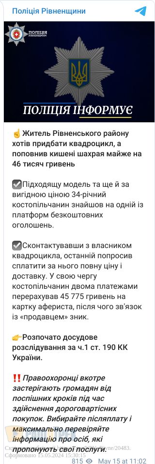 34-річний костопільчанин хотів придбати квадроцикл. Потрібну модель він знайшов на одній із платформ безкоштовних оголошень. Власник квадроцикла попросив чоловіка сплатити відразу повну ціну та доставку.