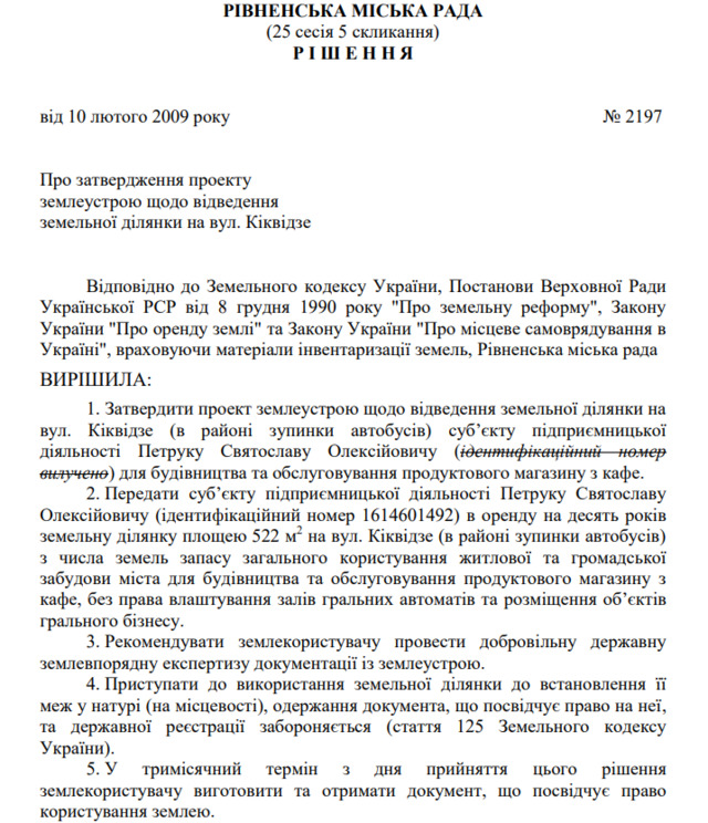 Тоді міською радою було ухвалено рішення про відведення земельної ділянки підприємцю для будівництва і обслуговування продуктового магазину з кафе.