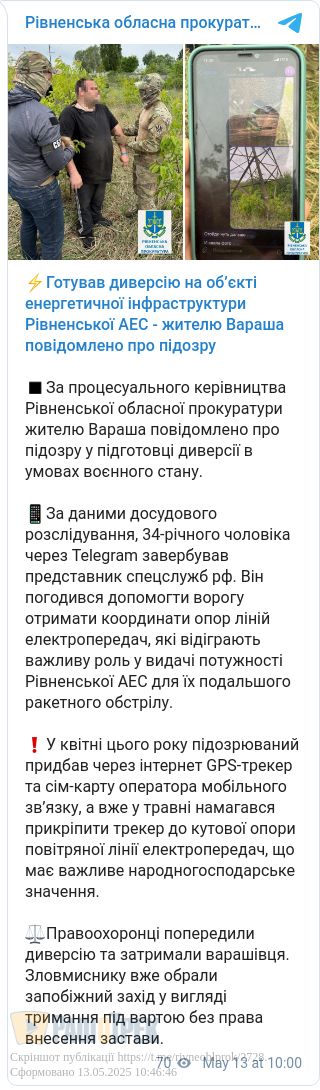 За даними слідства, 34-річний варашівець мав встановити GPS-маячок на опорі лінії електропередач, щоб навести російські дрони-камікадзе на енергооб’єкти, які живлять Київ.
