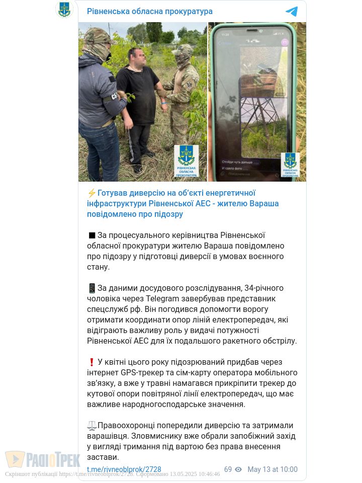 За даними слідства, 34-річний варашівець мав встановити GPS-маячок на опорі лінії електропередач, щоб навести російські дрони-камікадзе на енергооб’єкти, які живлять Київ.