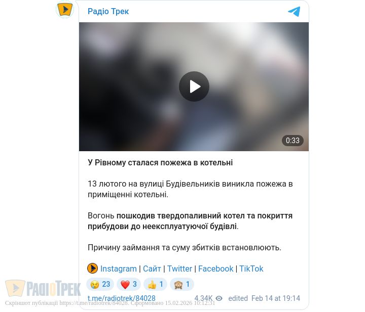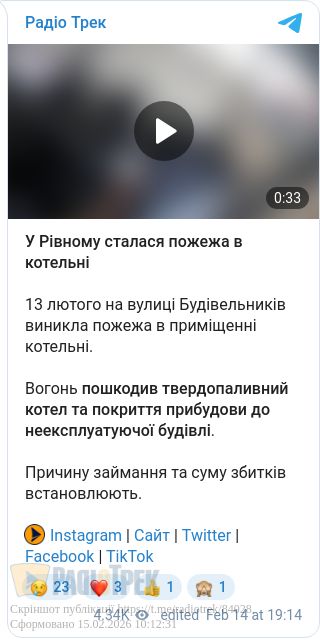 У Рівному вогнеборці ліквідували пожежу в приміщенні котельні. Повідомлення про загоряння надійшло до Служби порятунку 13 лютого о 13:38. Подія сталася на вулиці Будівельників.