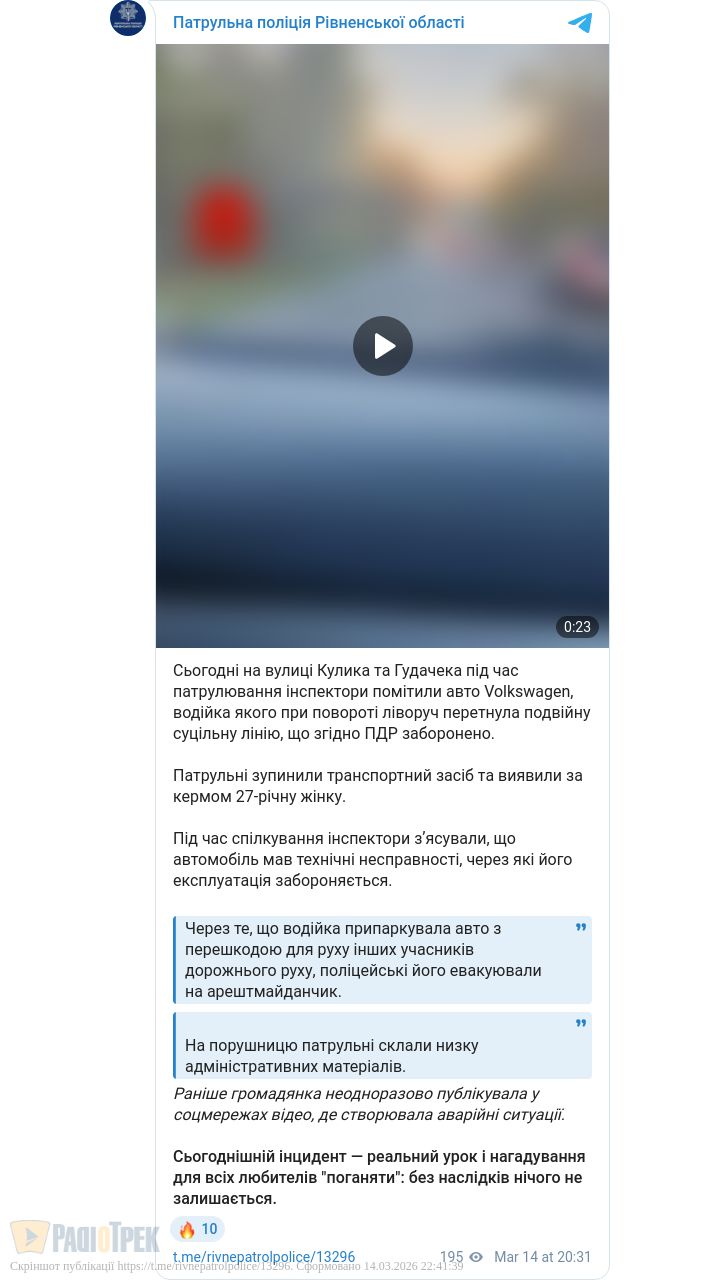 У Рівному патрульні зупинили водійку, яка порушила правила дорожнього руху.