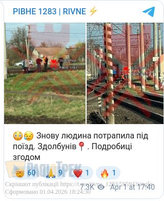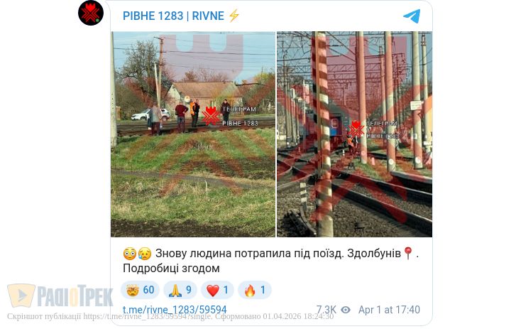У Здолбунові на Рівненщині сталася надзвичайна подія на залізниці — людина потрапила під поїзд.