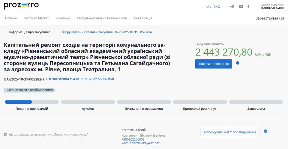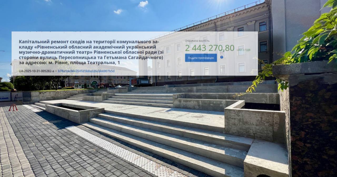 Майже два з половиною мільйони гривень планують витратити на ремонт сходів біля Рівненського музично-драматичного театру. Такий тендер нещодавно опублікували на сайті Прозорро.