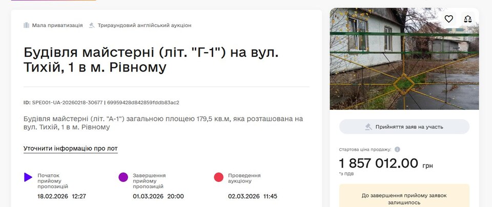Йдеться про одноповерхову будівлю площею 180 квадратних метрів на вулиці Тихій, 1. Стартова ціна — майже 2 мільйони гривень.