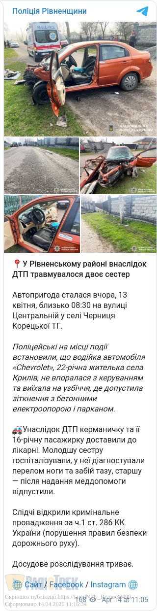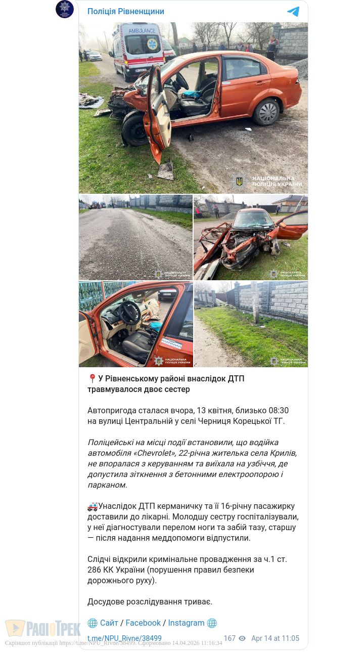 Дві сестри травмувалися у ДТП у Рівненському районі. Аварія сталася цими вихідними у селі Черниця Корецької громади.