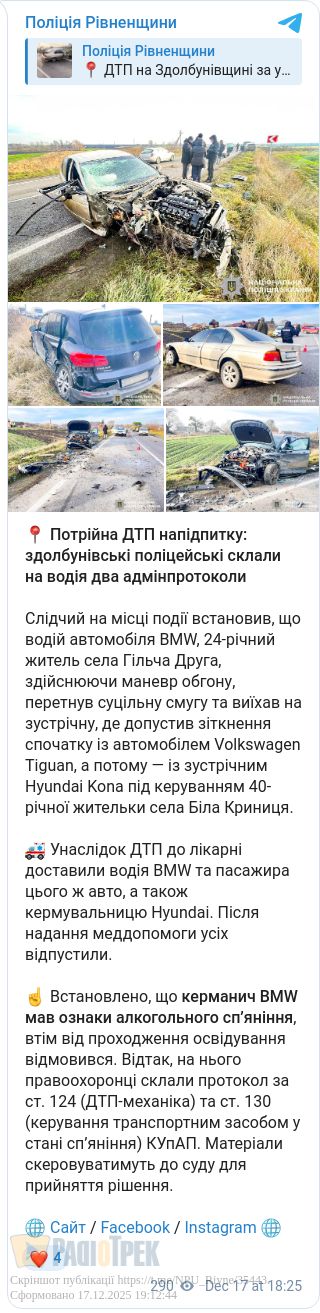 Сьогодні, близько 11:20 на трасі «Городище-Рівне-Старокостянтинів» у селі Лідаво, 24-річний водій BMW, виїхав на зустрічку та зіткнувся з Volkswagen Tiguan і Hyundai Kona.