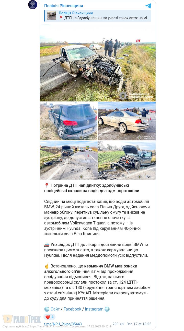 Сьогодні, близько 11:20 на трасі «Городище-Рівне-Старокостянтинів» у селі Лідаво, 24-річний водій BMW, виїхав на зустрічку та зіткнувся з Volkswagen Tiguan і Hyundai Kona.
