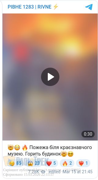У центрі Рівного, поблизу краєзнавчого музею, спалахнула пожежа у будинку. На місці події працюють пожежники.