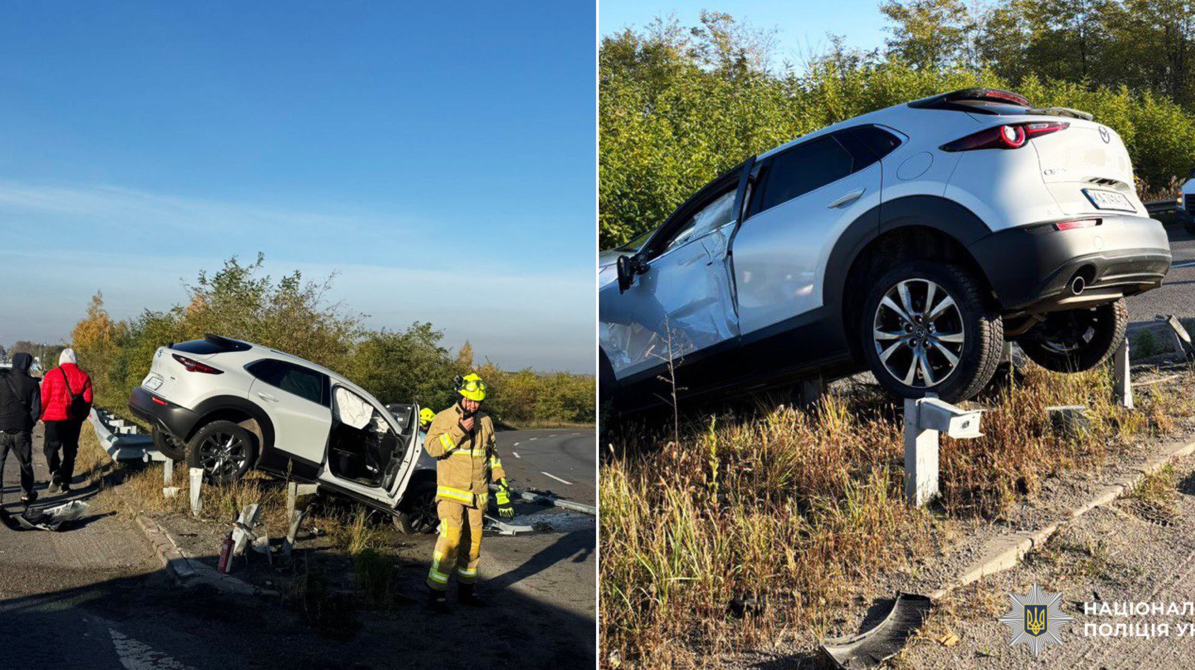 За попередньою інформацією, 48-річна водійка автомобіля Mazda, жителька Києва, не дотрималася безпечної швидкості, не впоралася з керуванням і врізалася у відбійник.