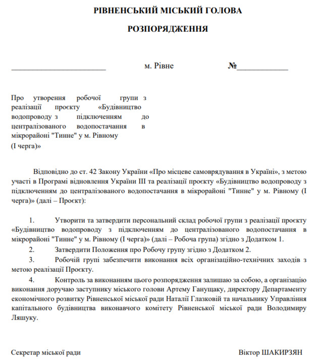 У мікрорайоні «Тинне» у Рівному може з’явитися централізоване водопостачання. Для будівництва водопроводу створили робочу групу, про це йдеться у розпорядження міського голови.
