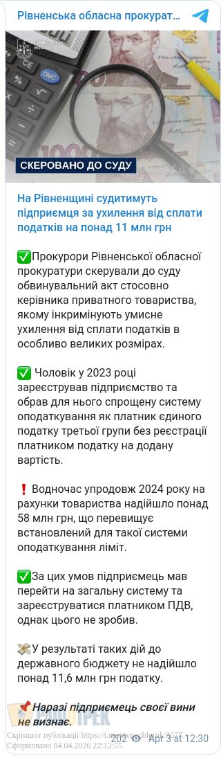 Як повідомили в обласній прокуратурі, керівник приватного товариства у 2023 році обрав спрощену систему оподаткування третьої групи без ПДВ, але наступного року на рахунки компанії надійшло понад 58 млн грн, перевищивши ліміт.
