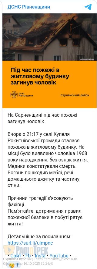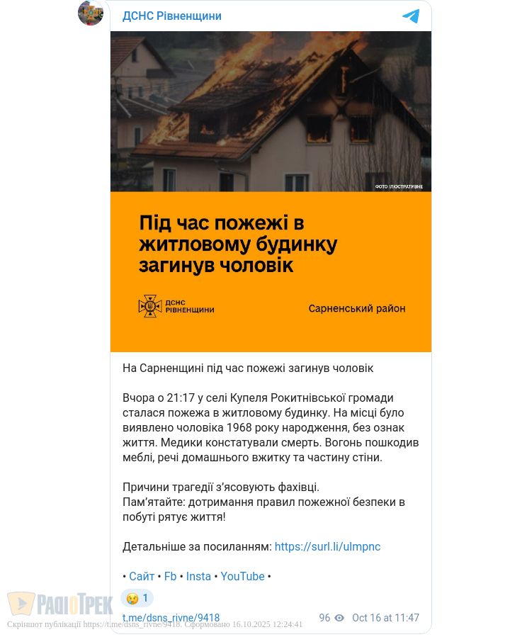 Чоловік загинув під час пожежі на Сарненщині. Загоряння сталося вчора ввечері в житловому будинку в селі Купеля.