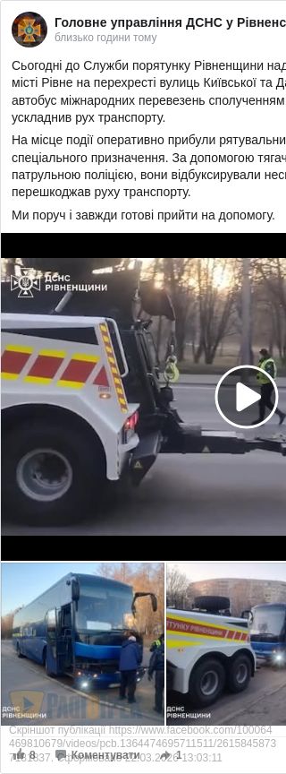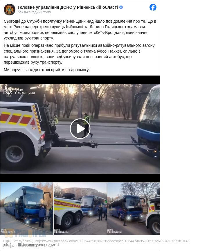 Рятувальники Рівненщини сьогодні зранку розблокували рух на перехресті вулиць Київської та Данила Галицького. Там зламався автобус міжнародних перевезень сполученням «Київ-Вроцлав», який значно ускладнив рух транспорту. За допомогою тягача Iveco Trakker, спільно з патрульною поліцією, вони відбуксирували несправний автобус, що перешкоджав руху транспорту. Чи були в автобусі пасажири, та як вони продовжать поїздку – у повідомлені не уточнюється.