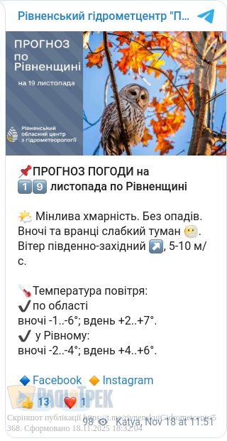 Завтра, 19 листопада, у Рівному та області очікується мінлива хмарність. Опадів не очікується, лише вночі та вранці можливий слабкий туман, повідомили в Рівненському обласному гідрометцентрі.