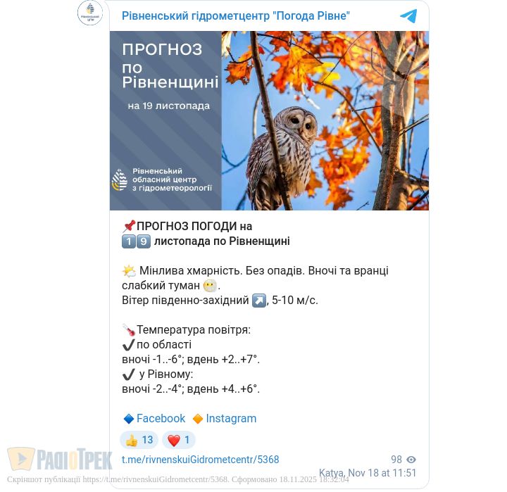 Завтра, 19 листопада, у Рівному та області очікується мінлива хмарність. Опадів не очікується, лише вночі та вранці можливий слабкий туман, повідомили в Рівненському обласному гідрометцентрі.