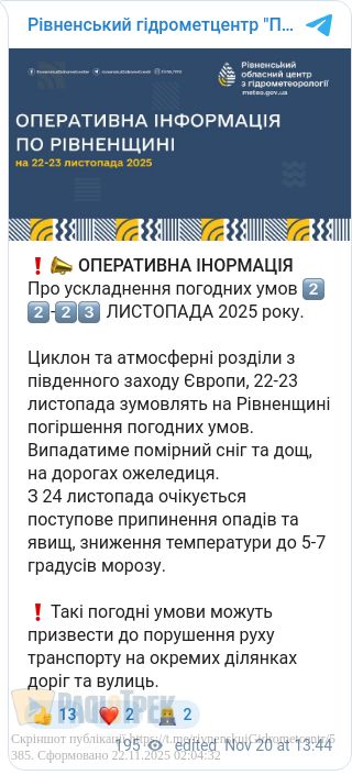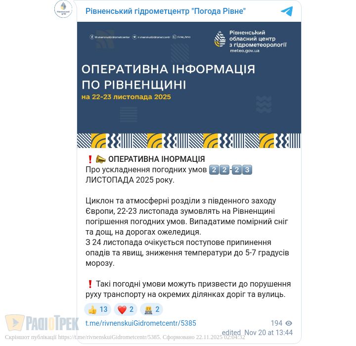 Сьогодні та завтра, 23 листопада, циклон та атмосферні розділи з південного заходу Європи зумовлять на Рівненщині погіршення погодних умов.