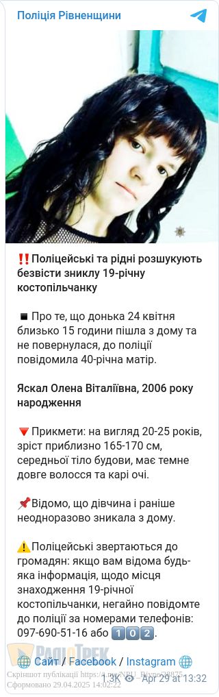 Якщо вам відома будь-яка інформація про Олену Яскал, повідомте про це правоохоронцям за номерами телефонів: 097-690-51-16 або 102.