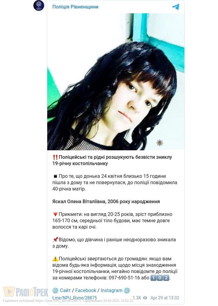 Якщо вам відома будь-яка інформація про Олену Яскал, повідомте про це правоохоронцям за номерами телефонів: 097-690-51-16 або 102.