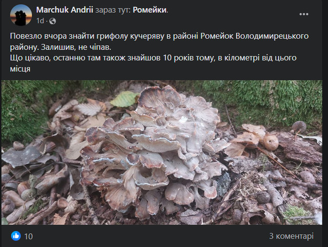 Пощастило вчора знайти грифолу кучеряву в районі Ромейок Володимирецького району. Залишив, не чіпав. Що цікаво, останню там також знайшов 10 років тому, в кілометрі від цього місця, – зауважив грибник Андрій Марчук в спільноті грибників у мережі.
