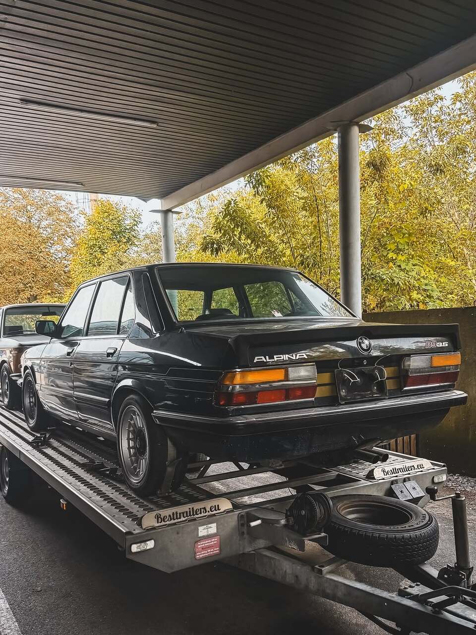 На українських дорогах помітили рідкісний автопоїзд: на автовозі перевозили одразу три колекційні автомобілі — BMW 2002tii Alpina A4 Tribute, BMW Alpina B9 (E28) та Mercedes-Benz 500SL AMG (R129).